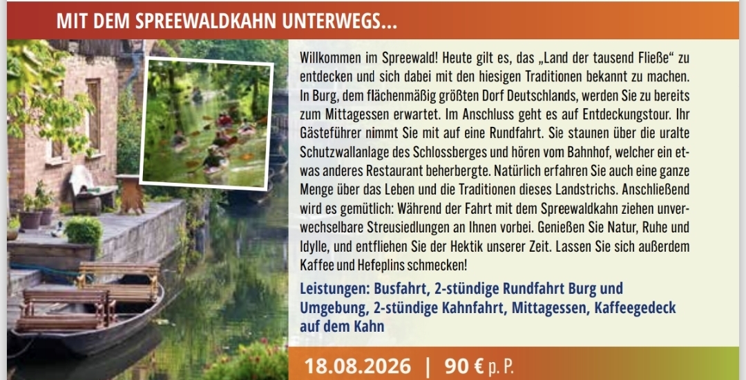 *Busfahrt *Spreewaldrundfahrt mit örtl. Reiseleitung *Mittagessen *Kahnfahrt ab Burg incl. Kaffeegedeck
