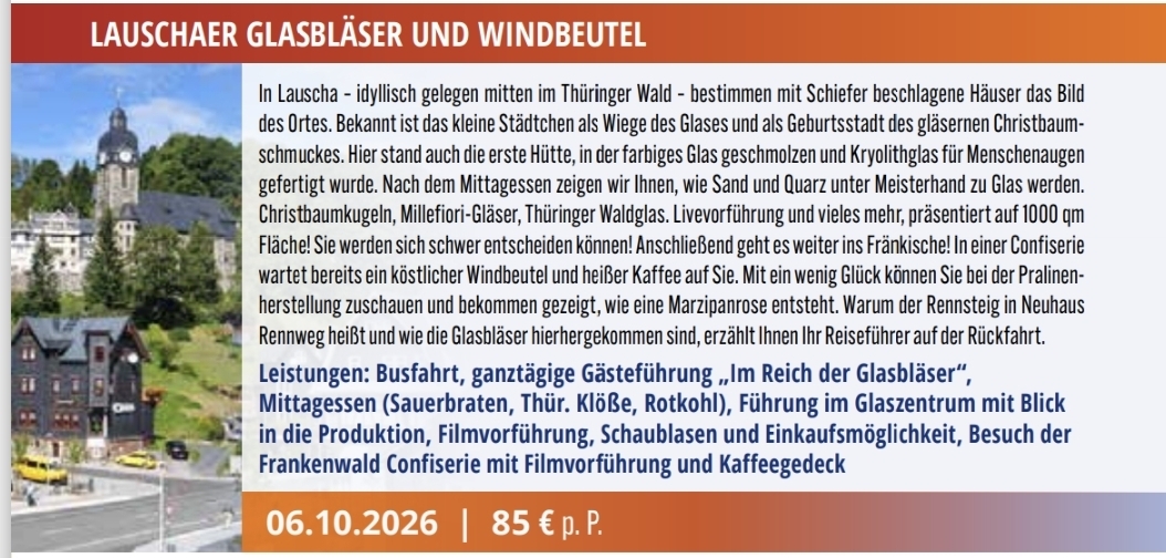 *Busfahrt *ganztägige örtl. Reiseleitung *Mittagessen *Schaublasen in Lauscha *Kaffeegedeck