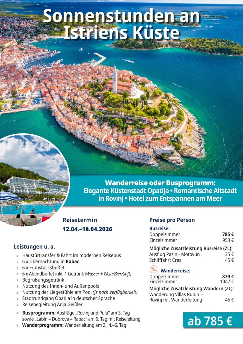 6x Ü/HP; Ausflüge: Rovinj und Pula, Labin-Dubrova-Rabac u.v.m.